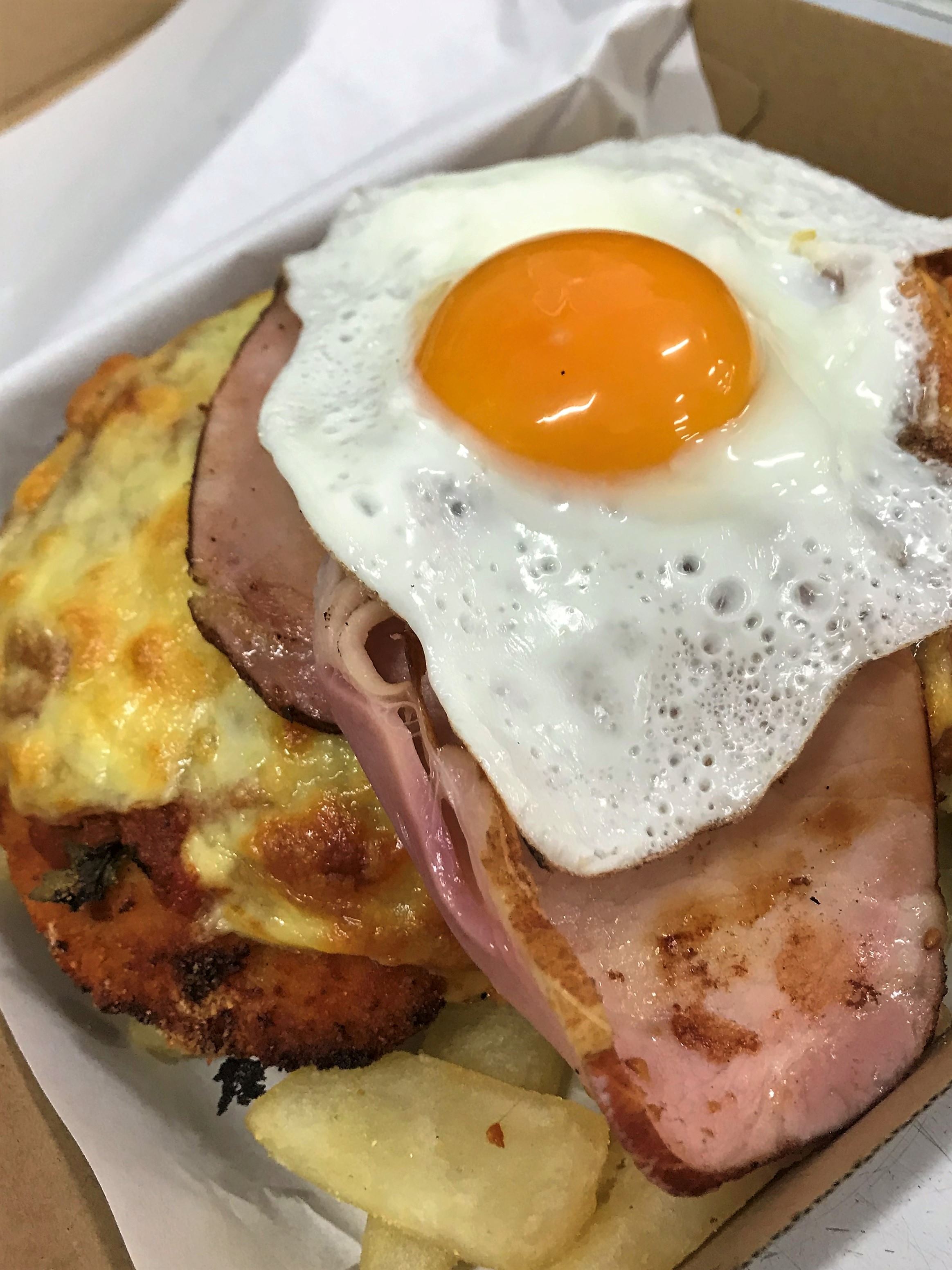 Freshly crumbed chicken breast, topped with homemade Napoli sauce, cheese, bacon & eggsides opt