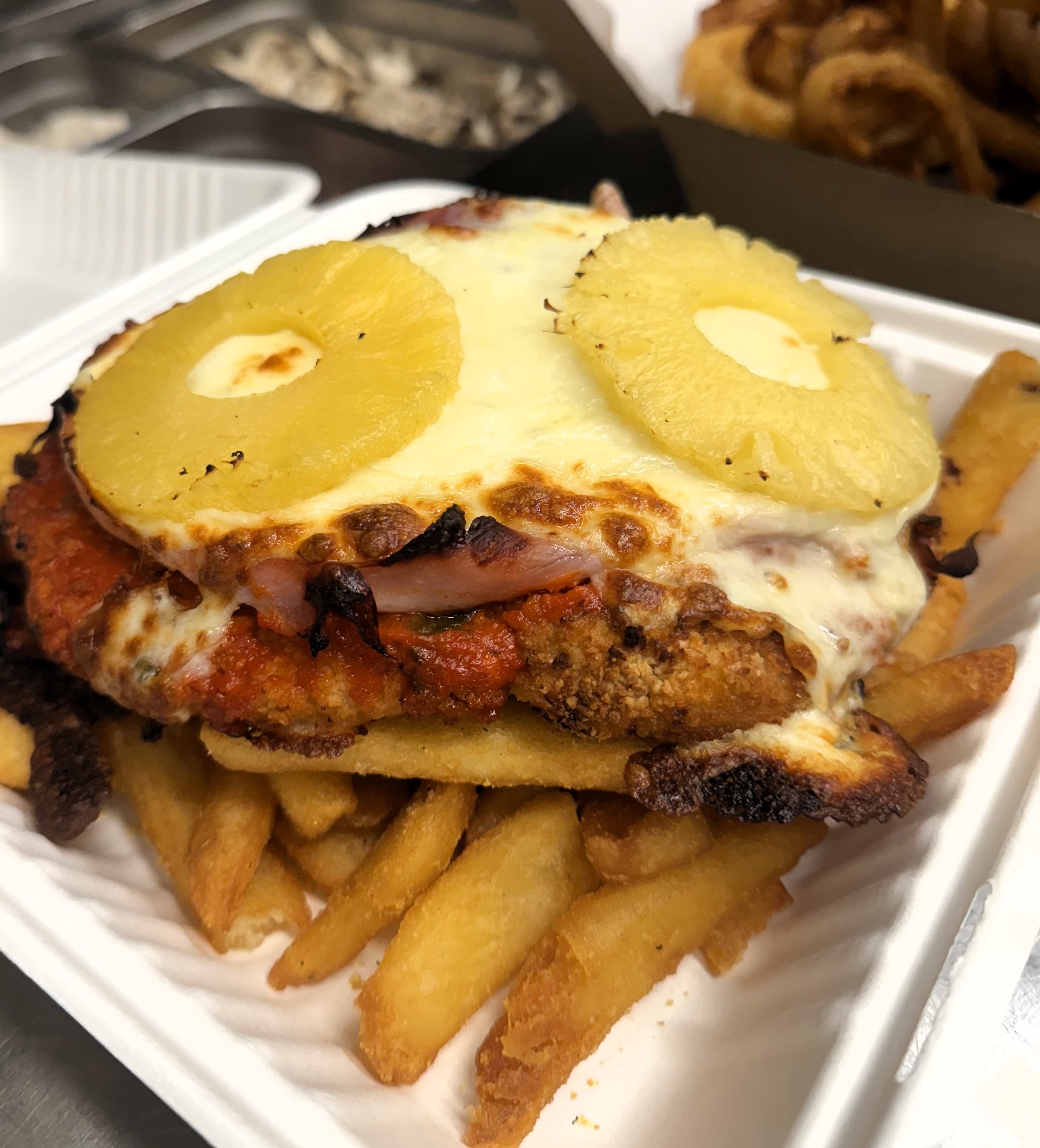 Freshly crumbed chicken breast, topped with homemade Napoli sauce, cheese, ham & pineapplesides opt
