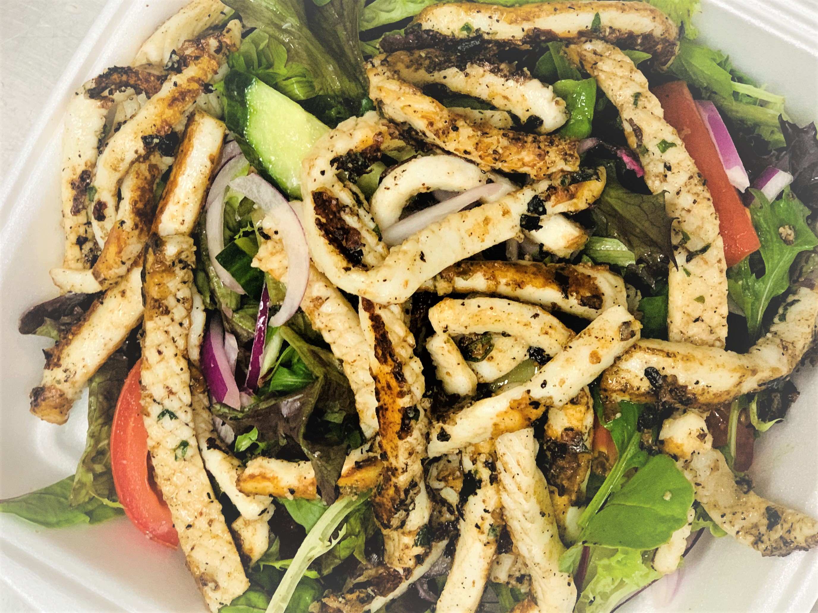$26Calamari strips lightly coated in rice flour seasoned with salt and pepper, shallow fried and finished with sea salt and spring onion, served with tartare sauce chips and saladYou may also like:Pasta