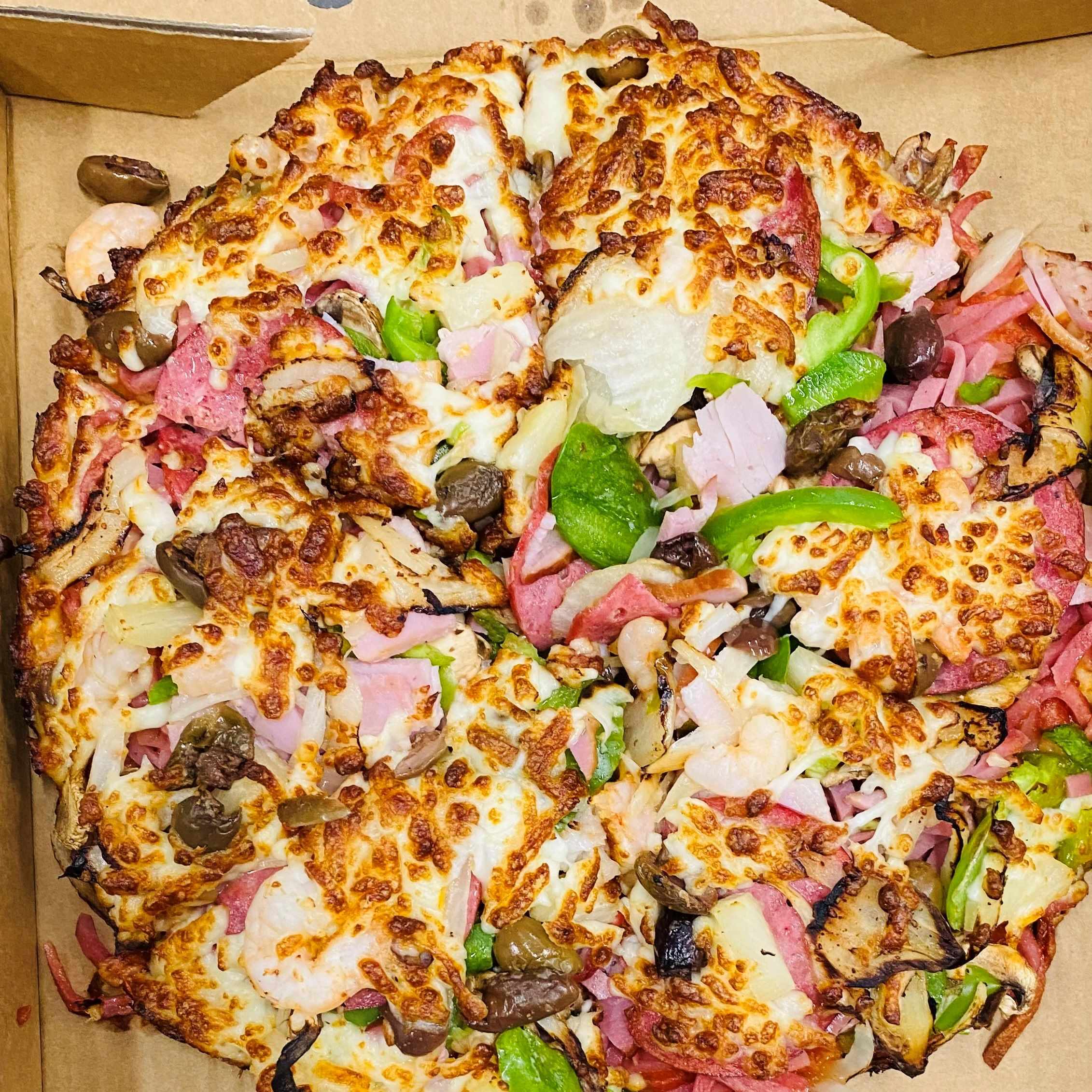 SupremeTomato, cheese, ham, mild salami, onion, capsicum, pineapple×